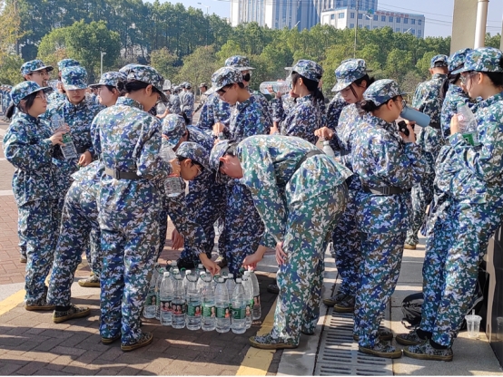 (辛苦训练许久后同学们在休息时间取水喝)